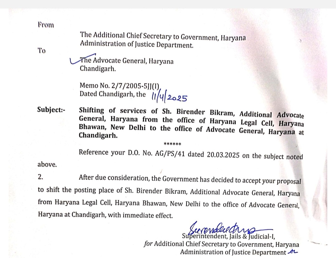 *हरियाणा सरकार ने अतिरिक्त एडवोकेट जनरल बीरेंद्र बिक्रम को हरियाणा लीगल सेल हरियाणा भवन दिल्ली से हरियाणा एडवोकेट जनरल कार्यालय चंडीगढ़ में किया ट्रांसफर /*