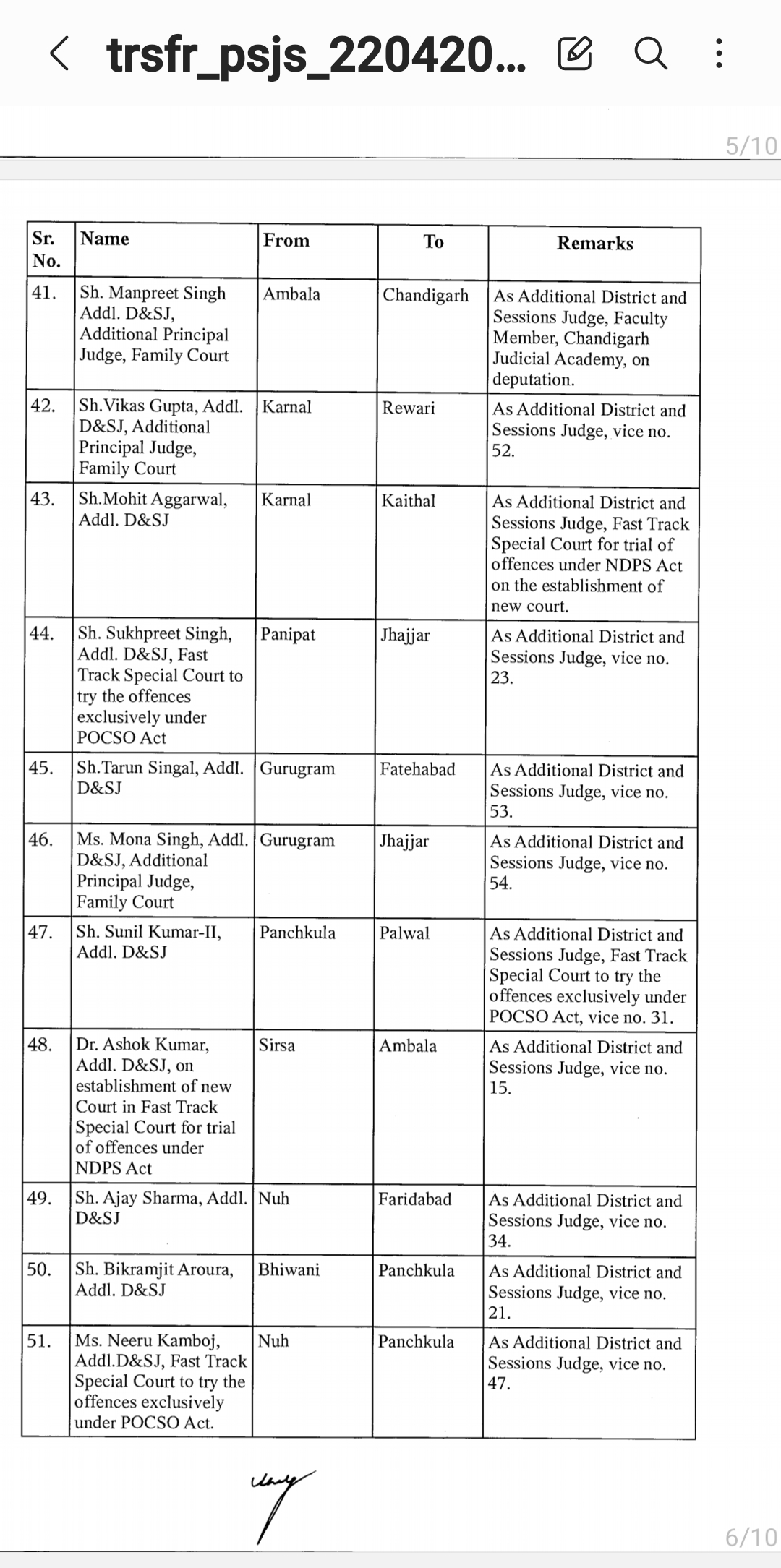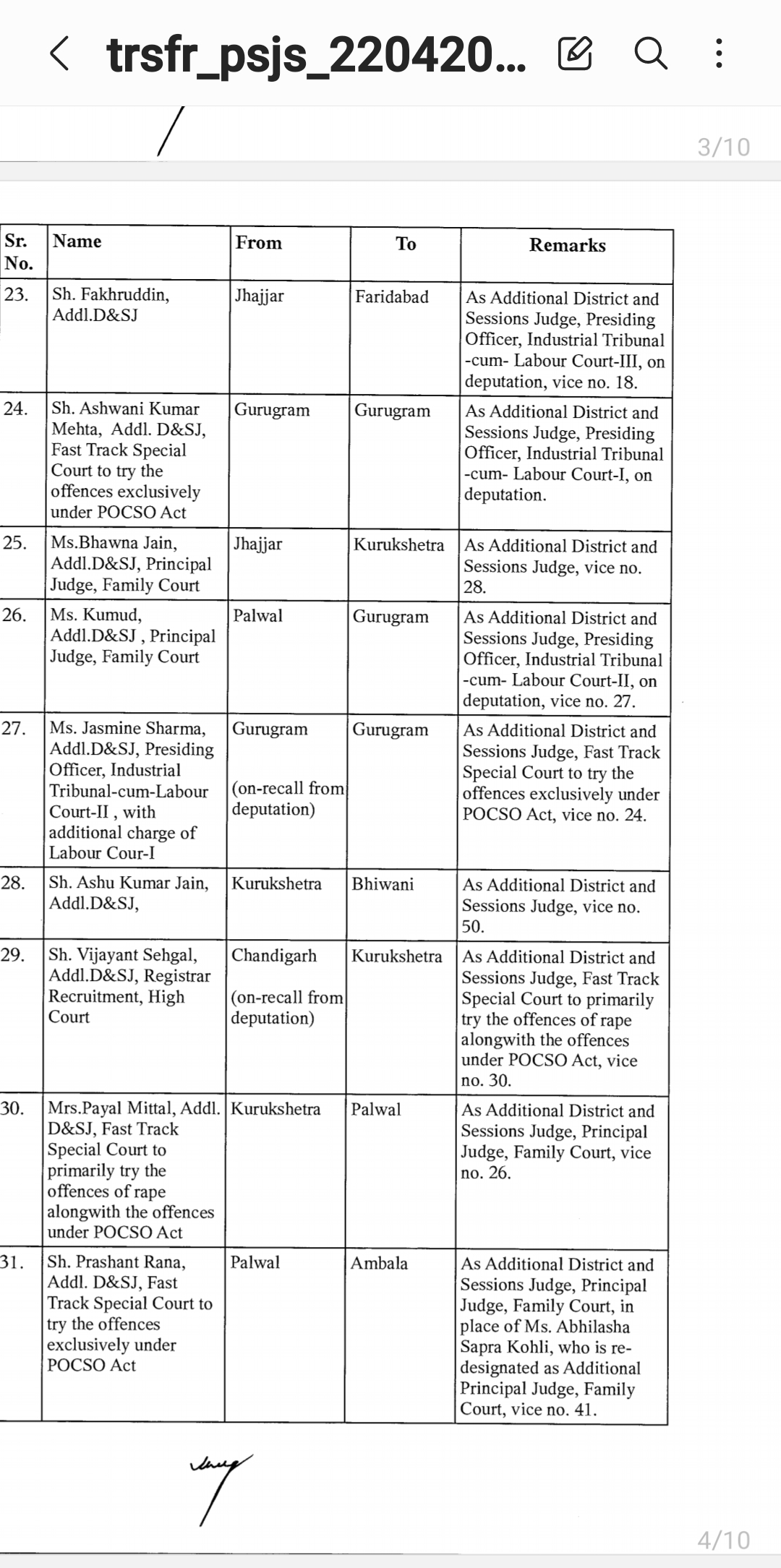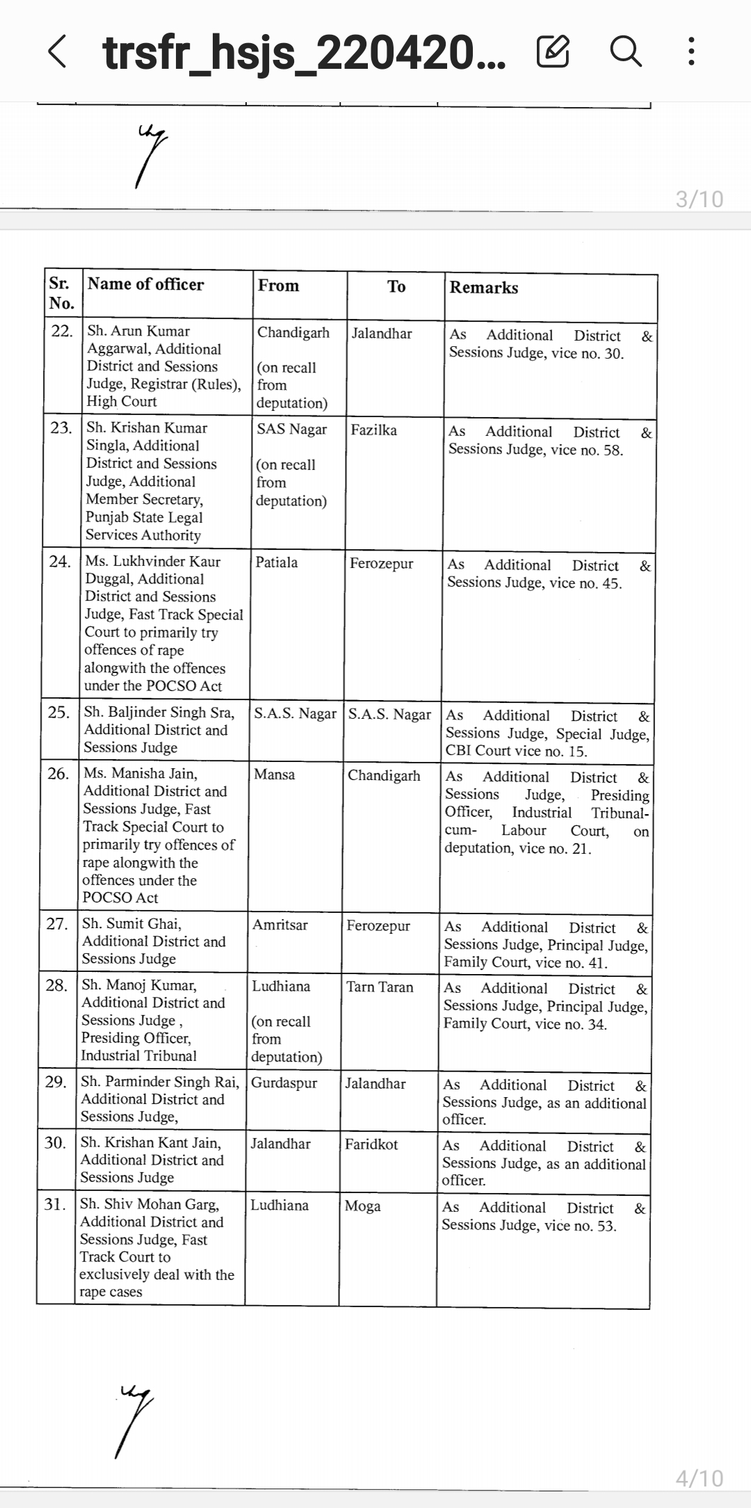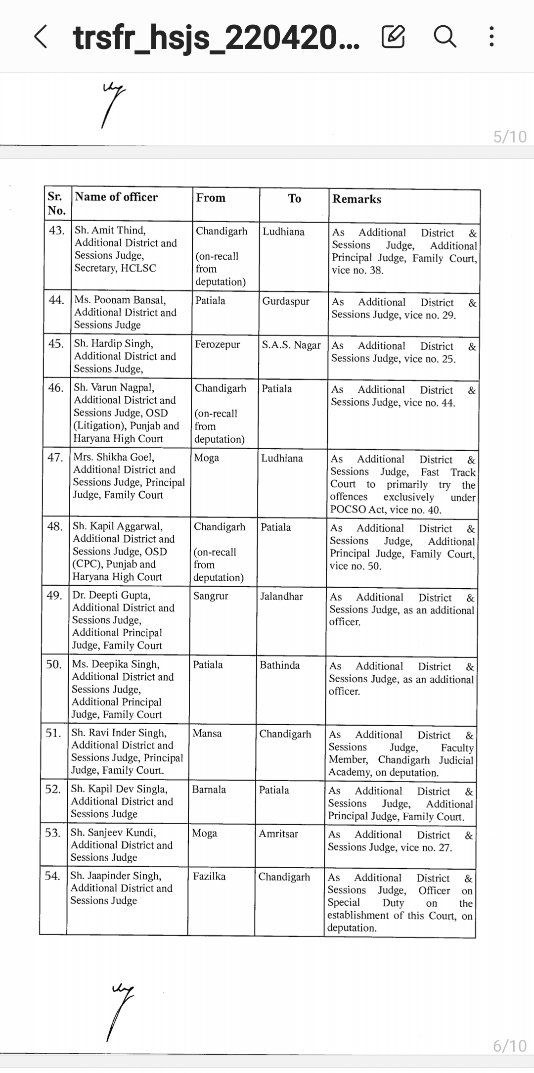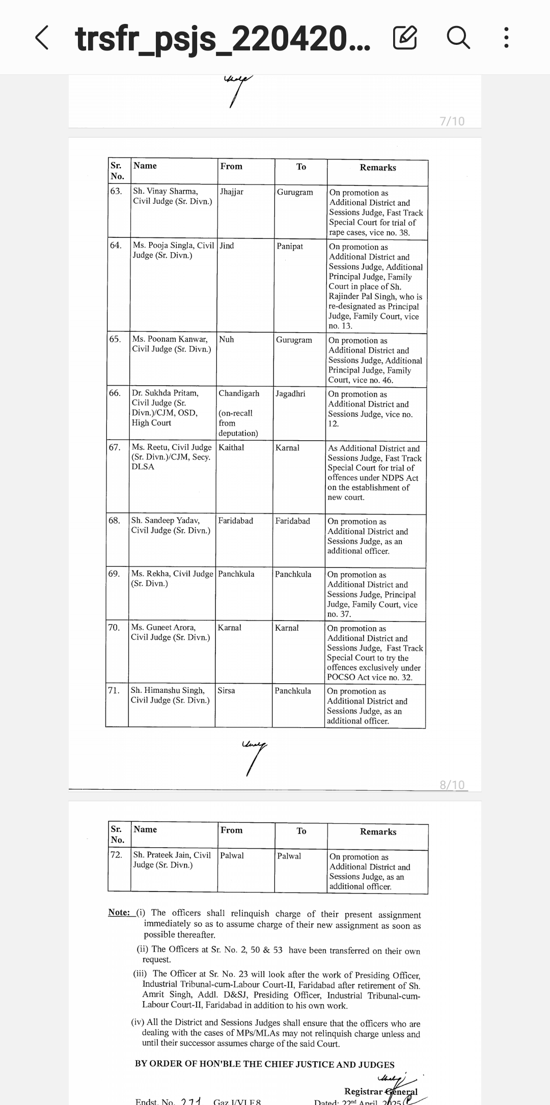 *पंजाब & हरियाणा हाइकोर्ट ने किए जजो के तबादले* *देखिए तबादला सूची*