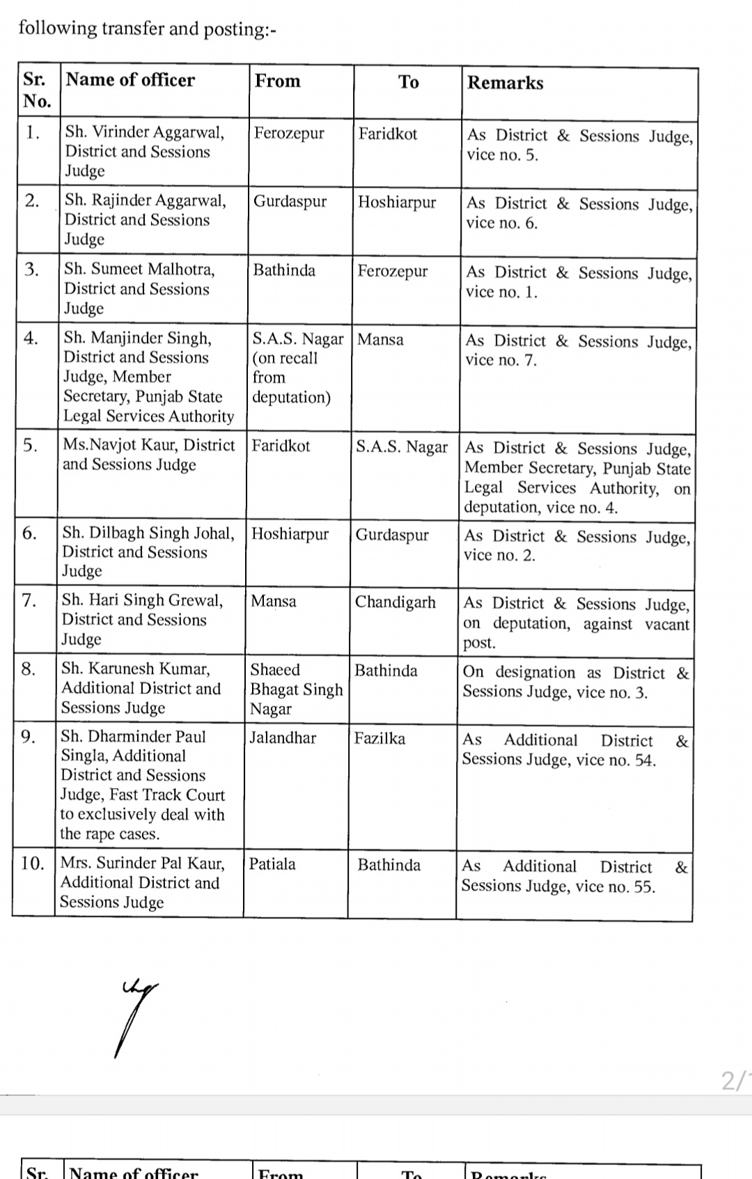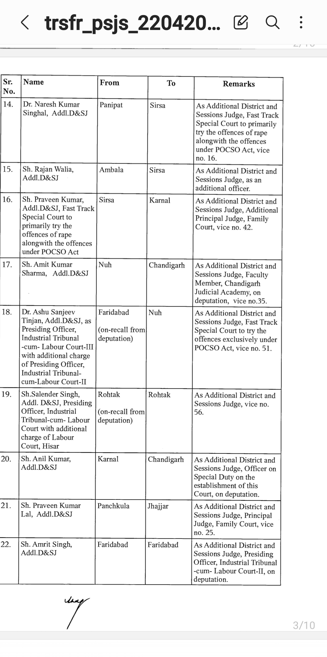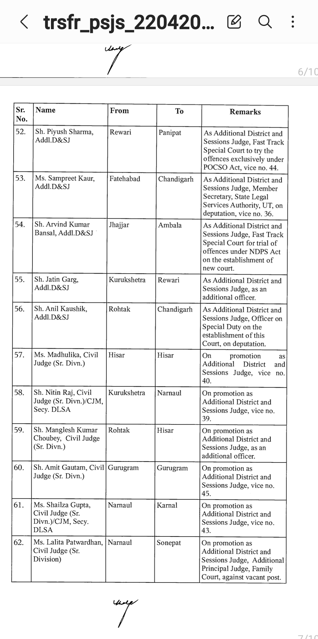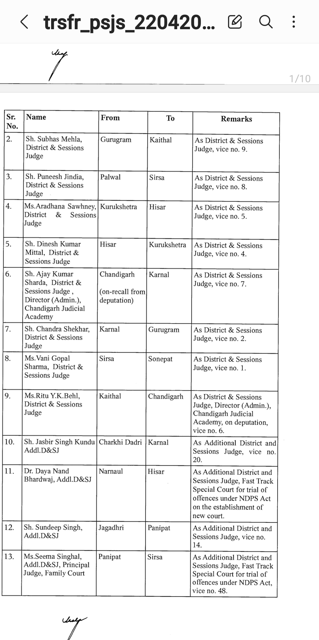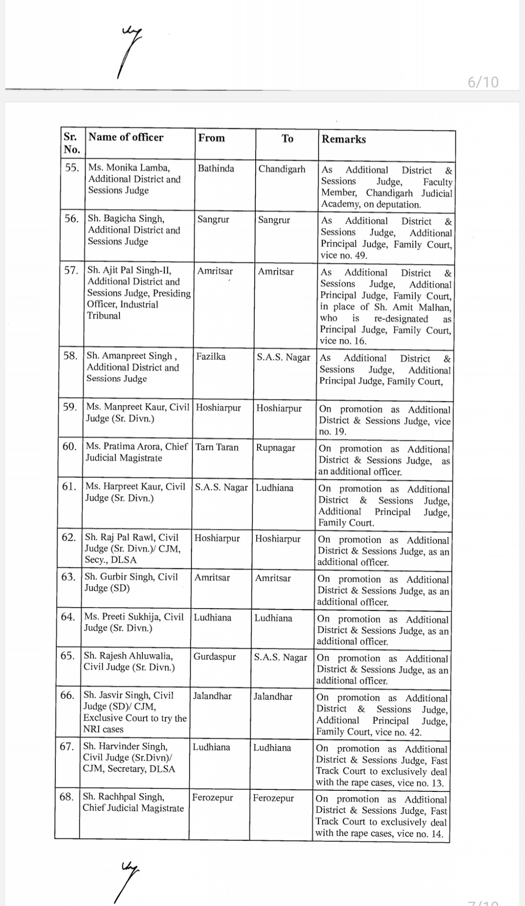 *पंजाब & हरियाणा हाइकोर्ट ने किए जजो के तबादले* *देखिए तबादला सूची*