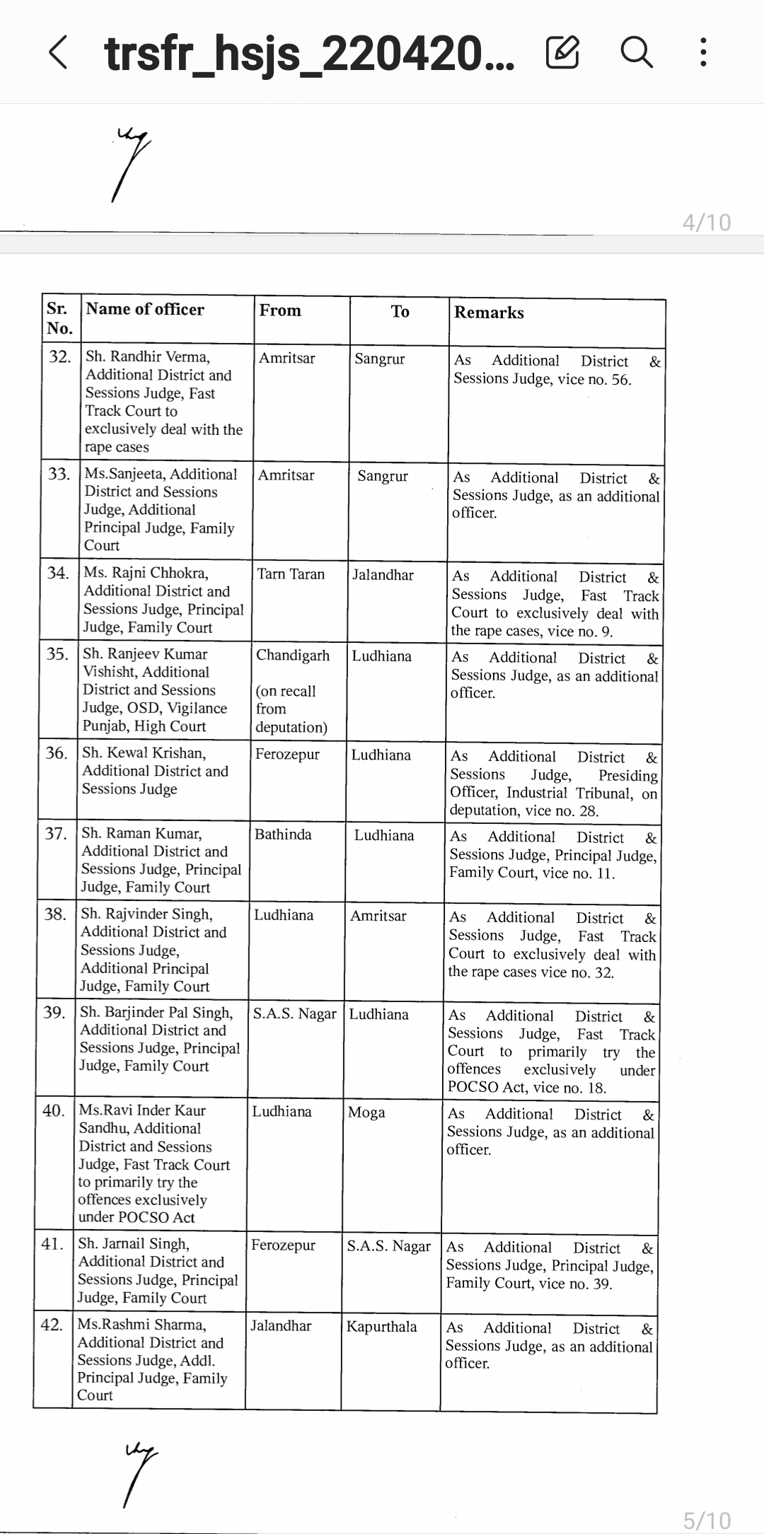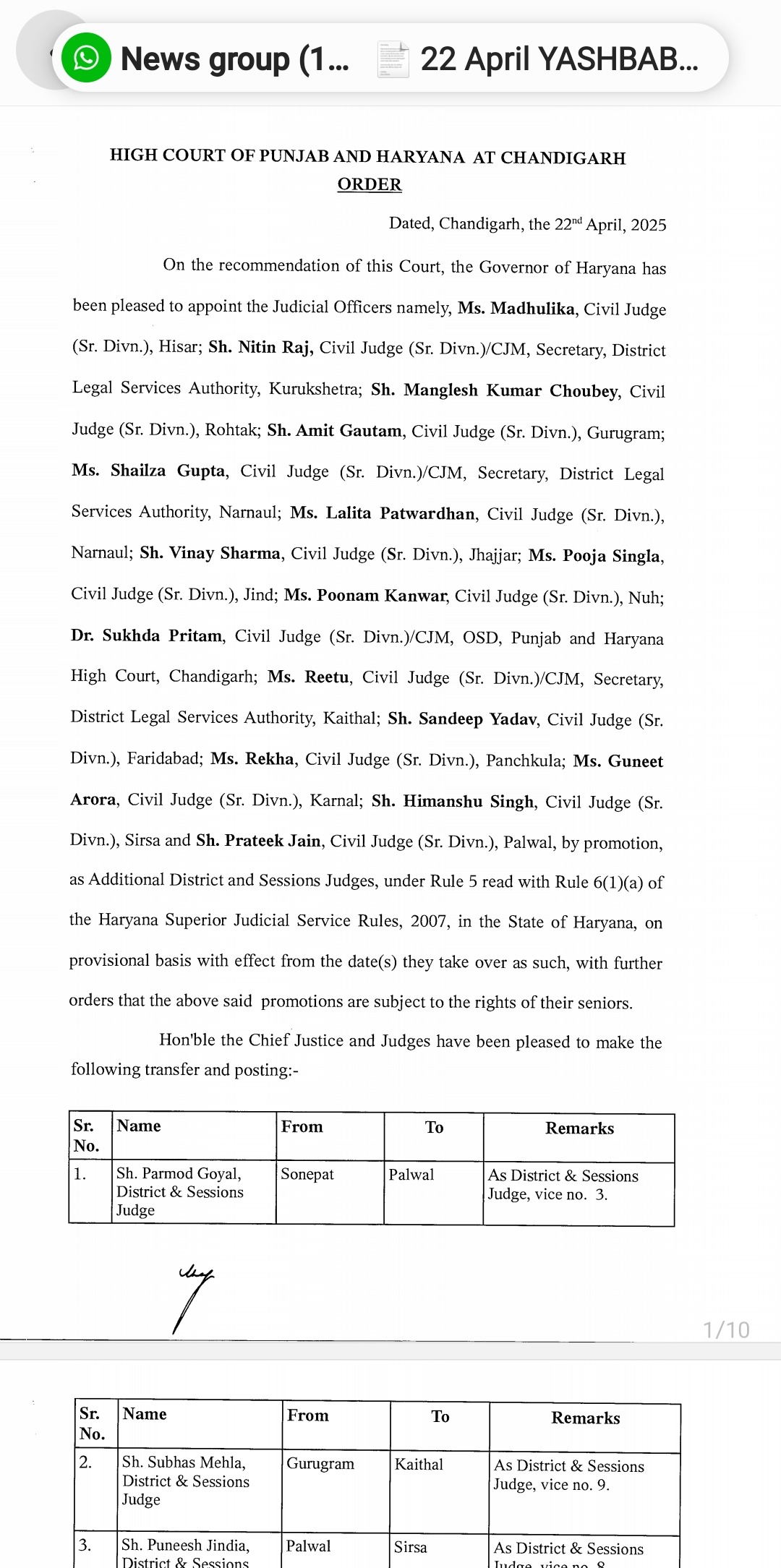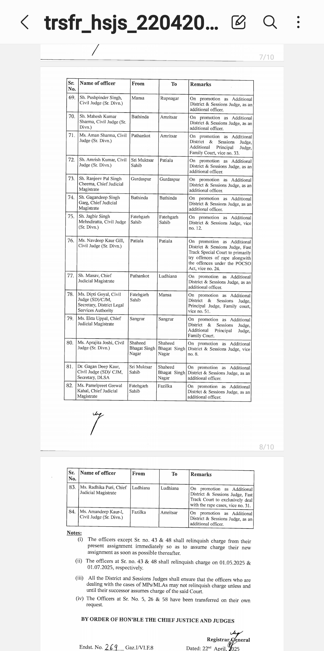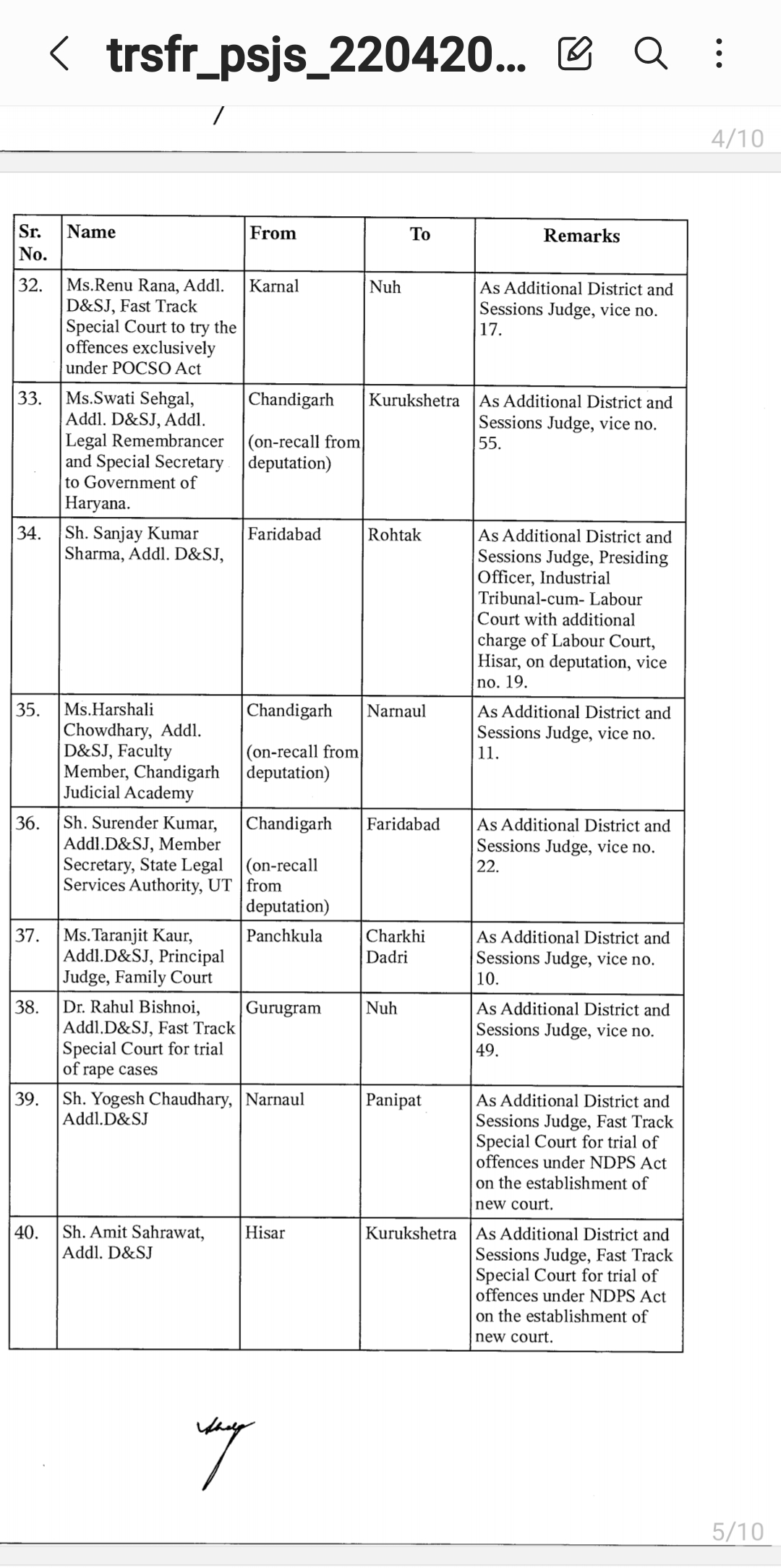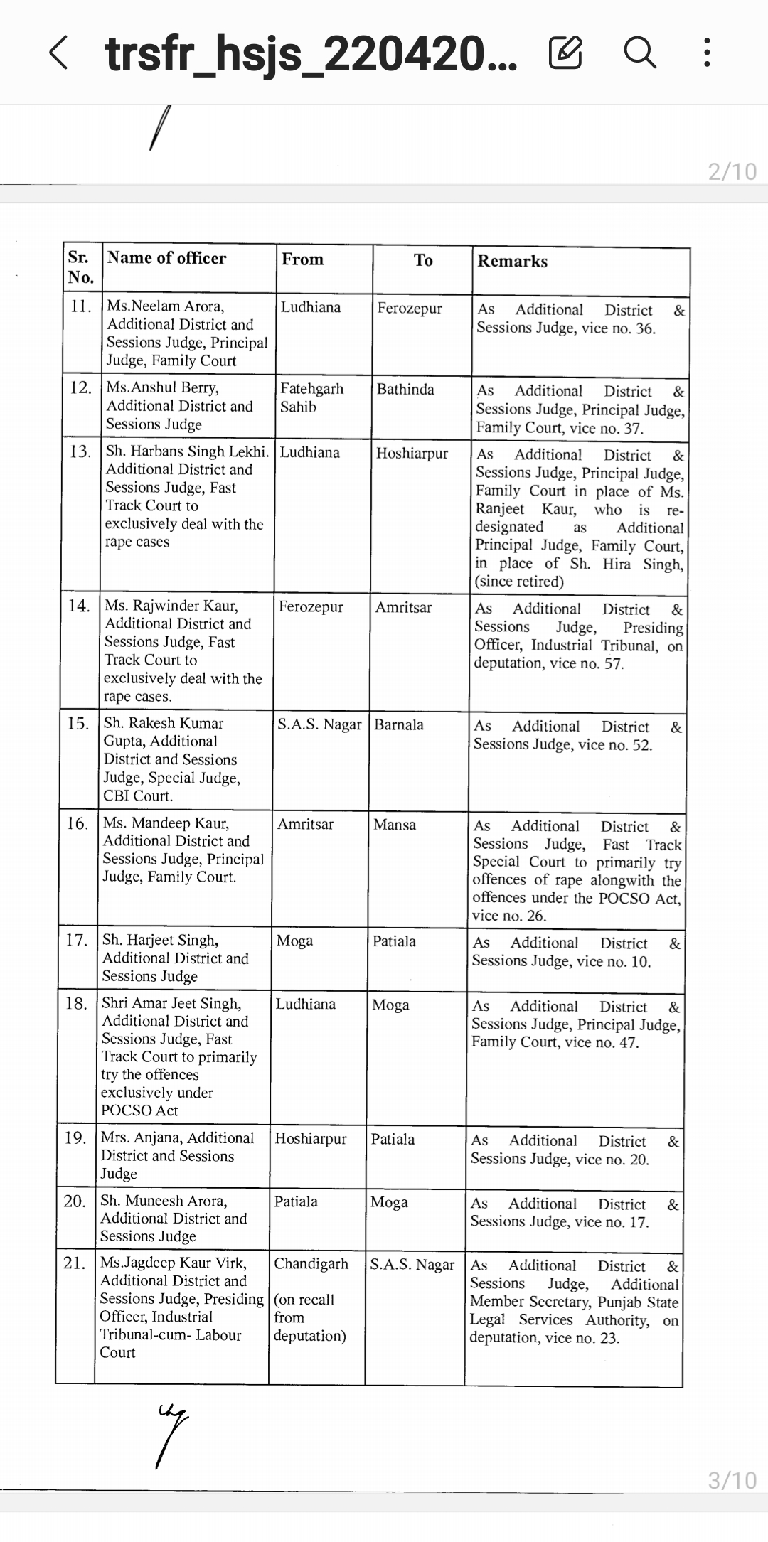 *पंजाब & हरियाणा हाइकोर्ट ने किए जजो के तबादले* *देखिए तबादला सूची*