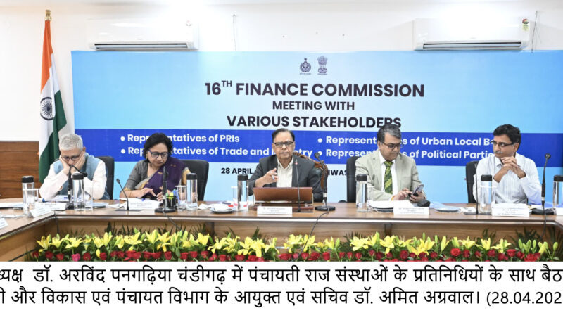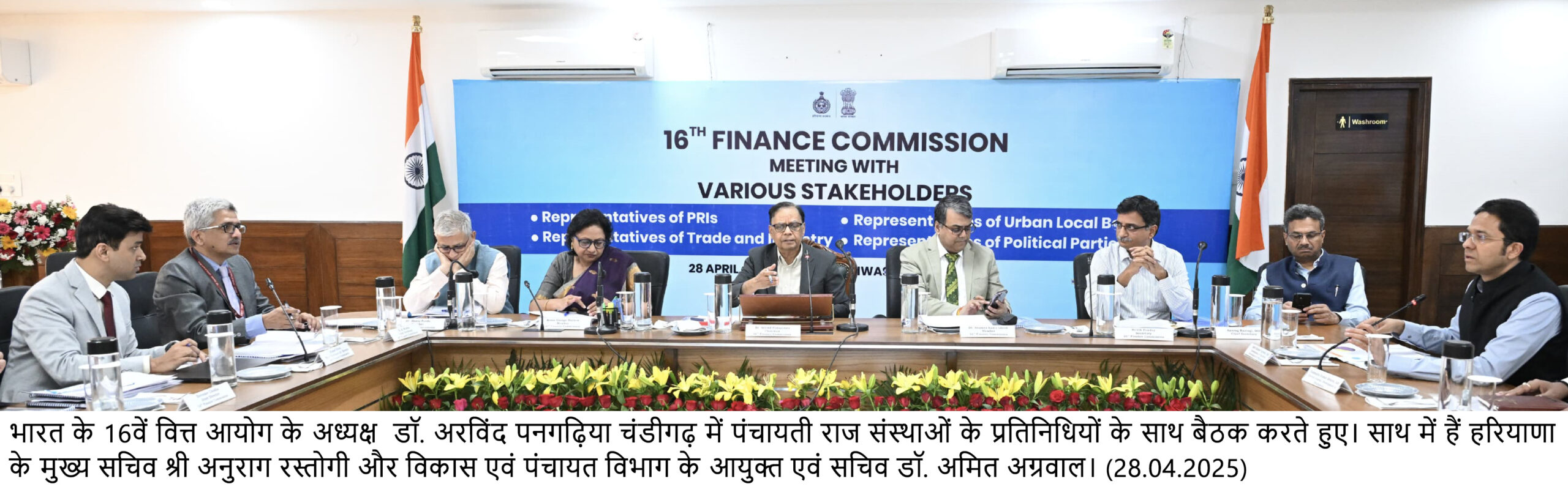 *भारत के 16वें वित्त आयोग के अध्यक्ष डॉ. अरविंद पनगढ़िया चंडीगढ़ में शहरी स्थानीय निकाय के प्रतिनिधियों के साथ बैठक करते हुए / साथ में हैं हरियाणा के मुख्य सचिव श्री अनुराग रस्तोगी और शहरी स्थानीय निकाय विभाग के आयुक्त एवं सचिव श्री विकास गुप्ता*