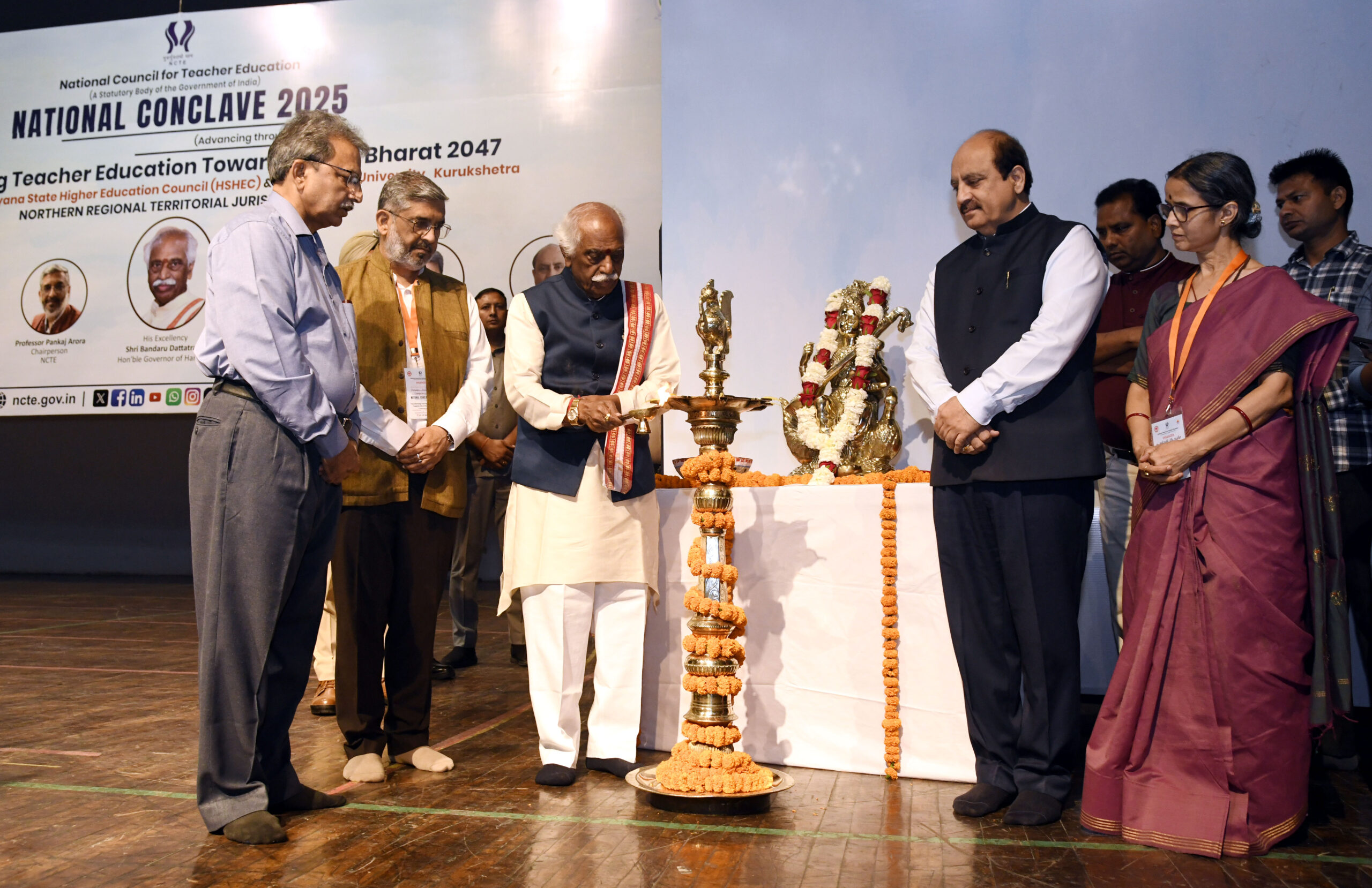 राज्यपाल श्री बंडारू दत्तात्रेय सोमवार को कुरुक्षेत्र विश्वविद्यालय में नेशनल काउंसिल फॉर टीचर एजुकेशन, हरियाणा स्टेट हायर एजुकेशन काउंसिल तथा कुरुक्षेत्र विश्वविद्यालय के संयुक्त तत्वावधान में ’शिक्षक शिक्षा में परिवर्तन विकसित भारत 2047 की दिशा में’ विषय पर आयोजित दो दिवसीय राष्ट्रीय सम्मेलन में बतौर मुख्यातिथि बोल रहे थे। राज्यपाल श्री बंडारू दत्तात्रेय, एनसीटीई के चेयरमैन प्रो. पंकज अरोड़ा, एचएसएचईसी के चौयरमेन प्रो. कैलाश चन्द्र शर्मा, कुलपति प्रो. सोमनाथ सचदेवा, एनसीटीई की सदस्य सचिव अभिलाषा झा मिश्रा ने दीप प्रज्ज्वलित कर एनसीटीई के ध्येय गीत के साथ कार्यक्रम का शुभारंभ किया।