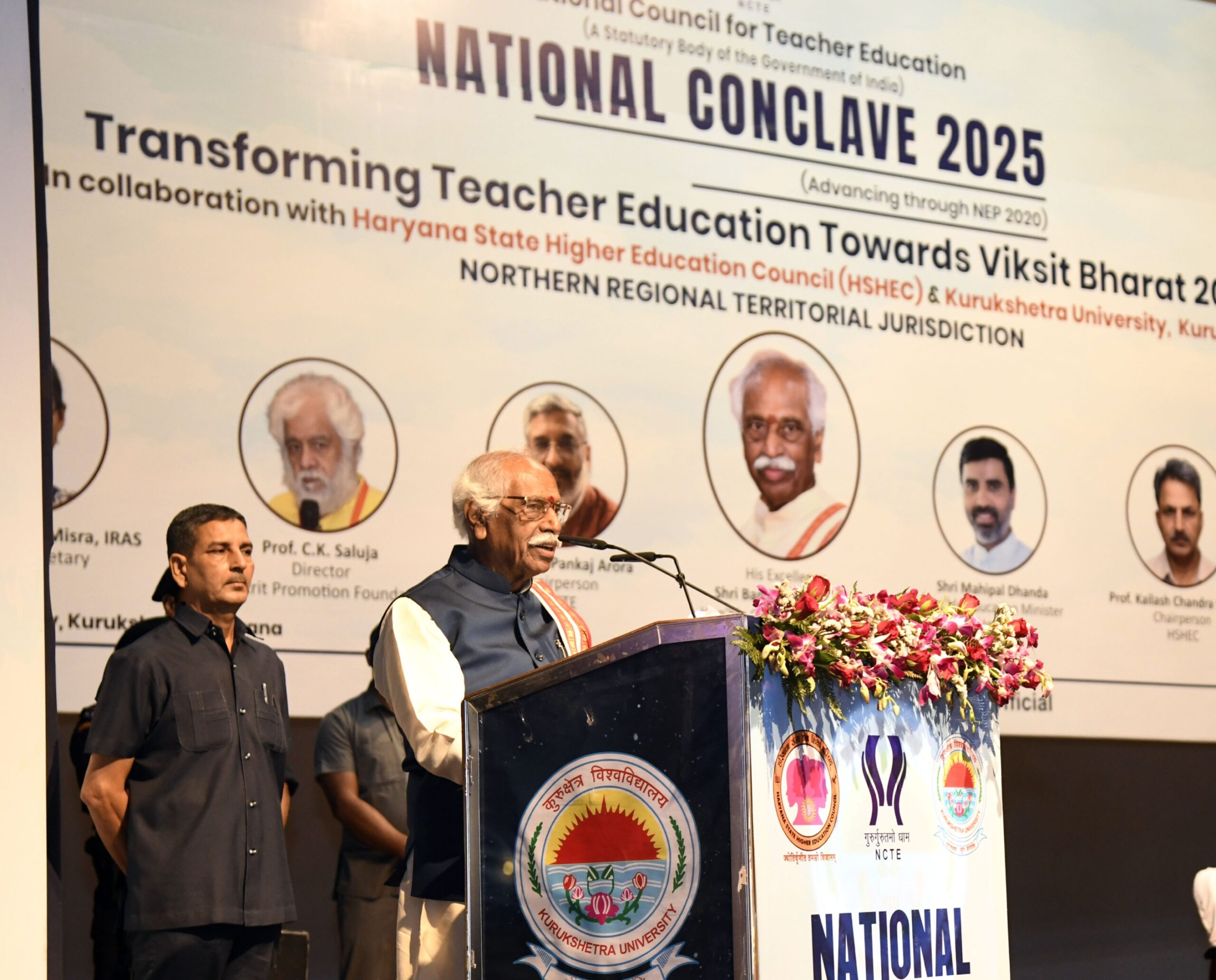 राज्यपाल ने कहा कि शिक्षा राष्ट्र की आत्मा होती है। यदि हम 2047 तक एक आत्मनिर्भर, समृद्ध और वैश्विक नेतृत्व वाला भारत बनाना चाहते हैं, तो शिक्षा की गुणवत्ता और शिक्षकों की भूमिका सर्वाधिक महत्वपूर्ण होगी। आज गीता स्थली कुरुक्षेत्र की ऐतिहासिक धरती से शिक्षक शिक्षा में परिवर्तन के नए युग का सूत्रपात कर रहे हैं, जो विकसित भारत 2047 के सपने की ओर एक निर्णायक कदम है। उन्होंने कहा कि शिक्षक केवल ज्ञान का संचारक नहीं होता, वह चरित्र निर्माण का शिल्पकार भी होता है। शिक्षक के शब्द विद्यार्थी के भविष्य को आकार देते हैं, उसकी सोच को दिशा देते हैं और उसमें नवाचार व सेवा की भावना का संचार करते हैं। उन्होंने कहा कि प्रधानमंत्री नरेंद्र मोदी जी के दूरदर्शी नेतृत्व में तैयार की गई नई शिक्षा नीति-2020 इसी दिशा में एक क्रांतिकारी पहल है। इस नीति का उद्देश्य शिक्षा को समावेशी, बहु-विषयी, गुणवत्तापूर्ण और वैश्विक मानकों के अनुरूप बनाना है। श्री बंडारू दत्तात्रेय ने शिक्षकों से अपील की, कि वे एक ’डिजिटल ज्ञान बैंक’ बनकर विद्यार्थियों को तकनीकी नवाचारों से जोड़े और विकसित भारत-2047 के लक्ष्य को पूर्ण करने में अपना योगदान सुनिश्चित करें। उन्होंने कहा कि देश और समाज के भविष्य का निर्माण करने के लिए एक अच्छे शिक्षक की जरूरत है। उन्होंने विश्वास व्यक्त किया कि एक अच्छे शिक्षक को तैयार करने की योजना में यह राष्ट्रीय सम्मेलन अहम् भूमिका अदा करेगा। एनसीटीई के चेयरपर्सन प्रो. पंकज अरोड़ा ने कहा कि इस राष्ट्रीय सम्मेलन में दो दिन शिक्षाविद् और विद्वानजन मिलकर शिक्षा और देश की भावी पीढ़ी विद्यार्थियों को शिक्षित और संस्कारित करने वाले एक अच्छे शिक्षक का निर्माण करने पर चर्चा करेंगे। आज एनसीटीई परिवर्तन के दौर से गुजर रहा है। आज उच्च गुणवत्ता वाले शिक्षक की निहायत जरूरत है। उन्होंने कहा कि राष्ट्रीय शिक्षा नीति 2020 को पूरे भारत में पूर्णतया जल्द लागू किया जा रहा है। इसके लिए 7 हजार फीडबैक लिए गए हैं। इन सुझावों के आधार पर आवश्यकता अनुसार शिक्षा नीति में परिवर्तन किए जाएंगे।हरियाणा राज्य उच्च शिक्षा परिषद के अध्यक्ष प्रो. कैलाश चन्द्र शर्मा ने कहा कि एनईपी 2020 का उद्देश्य आत्मनिर्भर, तर्कसंगत ढंग से सोचने वाले, क्रिया करने वाले, करूणा एवं मानवता के साथ साहसी, रचनात्मकता एवं कल्पनाशीलता की जड़ों से युक्त युवा तैयार करना। इस उद्देश्य को प्राप्त करने के लिए सभी स्तर की शिक्षण संस्थाओं में विद्यालय से लेकर उच्च शिक्षा तक क्रियान्वित करने के लिए सुझाव दिए गए हैं।
