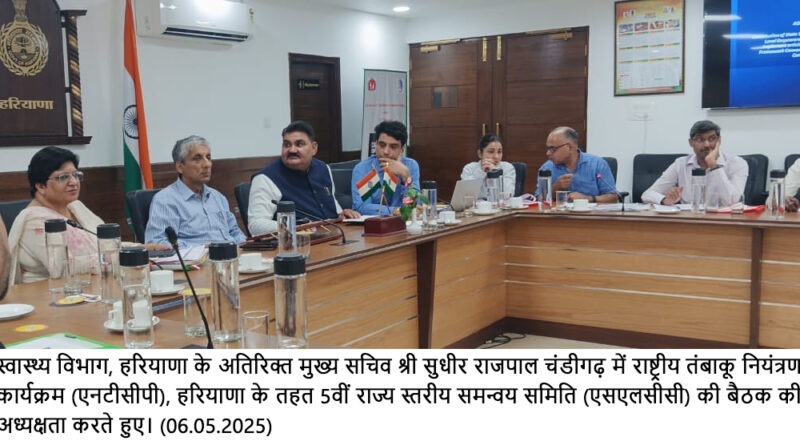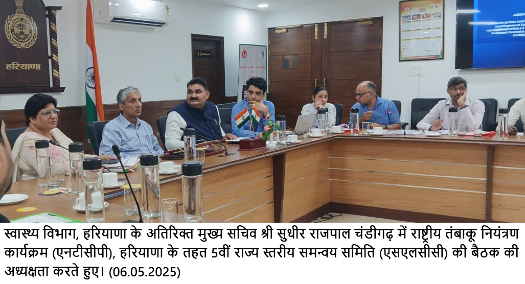 *हरियाणा स्वास्थ्य विभाग के अतिरिक्त मुख्य सचिव सुधीर राजपाल चंडीगढ़ में राष्ट्रीय तंबाकू नियंत्रण कार्यक्रम (एनटीसीपी), हरियाणा के तहत 5वीं राज्य स्तरीय समन्वय समिति (एसएलसीसी) की बैठक की अध्यक्षता करते हुए*