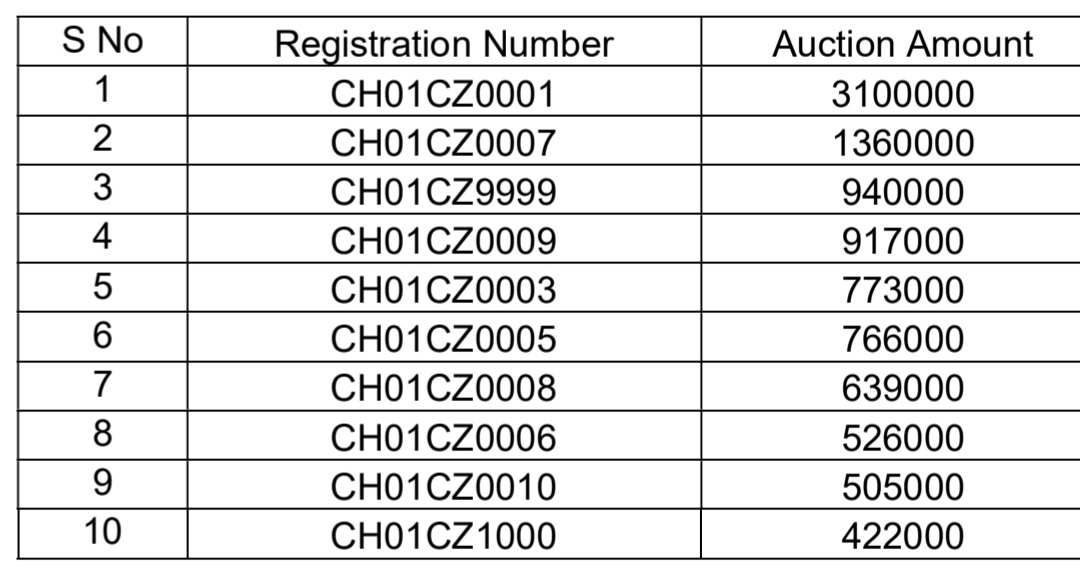 प्रधिकरण ने ई-नीलामी के अंतर्गत 31 लाख रुपये में अब तक का सबसे महंगा नम्बर- 0001 बेचा है।इसी तरह से 0007 नम्बर की 13 लाख 60 हजार की बोली गयी है। मिली जानकारी के अनुसार चंडीगढ़ प्राधिकरण ने इस बार कुल 2 करोड़ 94 लाख 27 हजार की राशि की अर्जित की है। रजिस्टरिंग एवं लाइसेंसिंग प्राधिकरण, यू.टी., चंडीगढ़ के कार्यालय ने दिनांक 18.05.2025 से 20.05.2025 तक वाहन संख्या 0001 से 9999 तक नई श्रृंखला “CH01-CZ” के वाहन पंजीकरण नंबरों (फैंसी एवं चॉइस) तथा पिछली श्रृंखला के बचे हुए फैंसी/विशेष पंजीकरण नंबरों की ई-नीलामी की जिसमें कुल पंजीकरण नंबरों की नीलामी की गई है। परिणामस्वरूप, प्राधिकरण को 2,94,21,000/- रुपए का बड़ा राजस्व प्राप्त हुआ। स्मरण रहे अत्यंत मेहनती एवं जागरूक रजिस्ट्रार प्रद्युमन सिंह की देखरेख में रजिस्टरिंग एवं लाइसेंसिंग प्राधिकरण चंडीगढ़ नंबरों की ई-नीलामी में हर बार करोड़ों की कमाई करके खुद ही अपना पिछला रिकॉर्ड तोड़ता हैं। यह यह भी अपने आप में एक मिसाल कायम हुई है