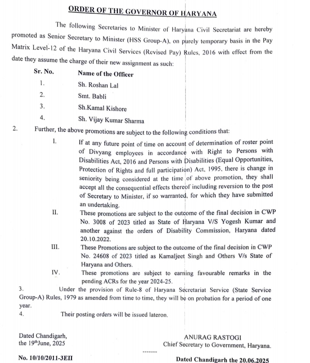 *हरियाणा सरकार ने हरियाणा सिविल सचिवालय चंडीगढ़ में कार्यरत मिनिस्टर के सचिव कमल किशोर सहित 4 सचिवों को तरक्की प्रदान कर बनाया वरिष्ठ सचिव* *सरकार ने आदेश किये जारी*