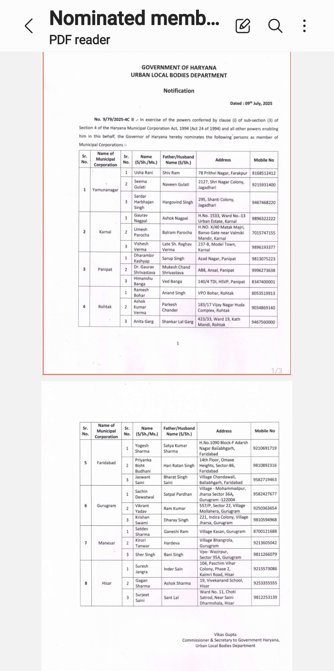 *हरियाणा सरकार ने सभी म्युनिसिपल कॉर्पोरेशन में नॉमिनेट सदस्य किये नियुक्त, देखें लिस्ट*