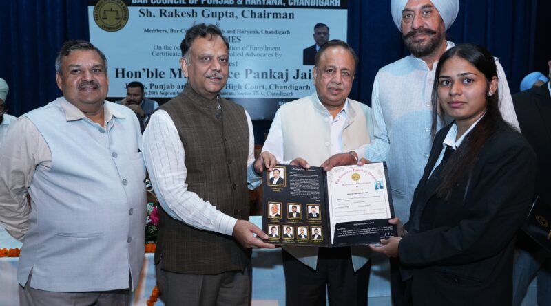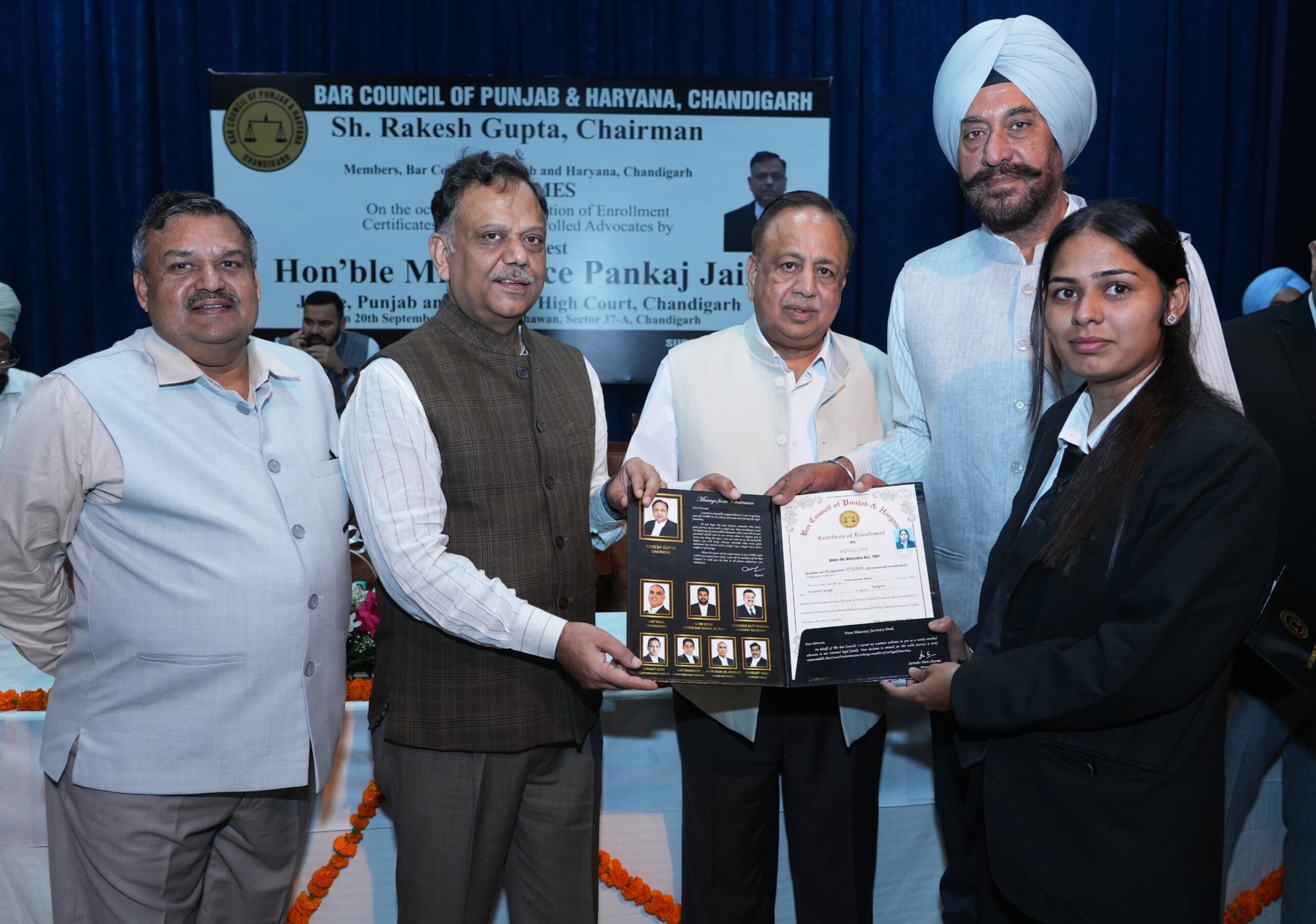 चंडीगढ़ ;- पंजाब एवं हरियाणा उच्च न्यायालय के न्यायाधीश माननीय न्यायमूर्ति पंकज जैन ने आज अर्थात 20.09.2025 को विधि भवन में पंजाब एवं हरियाणा बार काउंसिल द्वारा आयोजित दीक्षांत समारोह में मुख्य अतिथि के रूप में भाग लिया और नव-नामांकित अधिवक्ताओं को शपथ दिलाकर 574 नामांकन प्रमाण पत्र वितरित किए। माननीय न्यायाधीश ने उन्हें वकालत में सफलता की कामना करते हुए, नए प्रवेशकों को स्वयं पर गर्व करने और कानूनी पेशे की गरिमा बनाए रखने के लिए प्रेरित किया। माननीय न्यायाधीश ने उन्हें एक बदमाश समूह न बनने, बल्कि संस्थान की गरिमा को बनाए रखते हुए इसके पथप्रदर्शक बनने के लिए प्रोत्साहित किया।