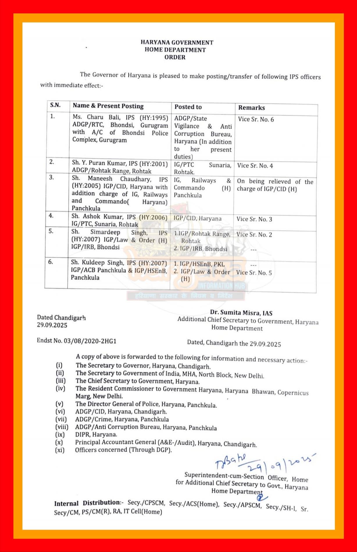 करनालखेलचंडीगढ़जिंददेश-विदेशपंचकुलापंजाबपानीपतहरियाणा *हरियाणा सरकार ने तुरंत प्रभाव से IPS अधिकारियों के किए तबादले* September 29, 2025 RAJESH OBEROI *राणा ओबराय* *राष्ट्रीय खोज/भारतीय न्यूज,* ,,,,,,,,,,,,,,,,,,,, *हरियाणा सरकार ने तुरंत प्रभाव से IPS अधिकारियों के किए तबादले*