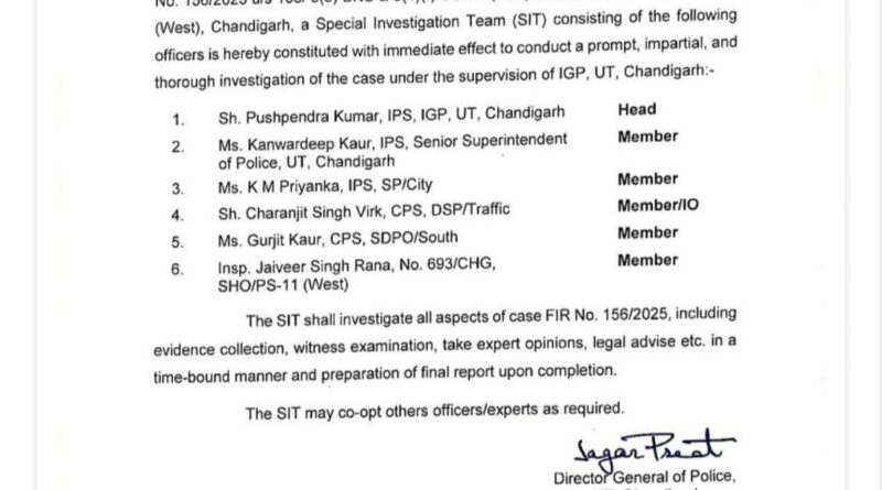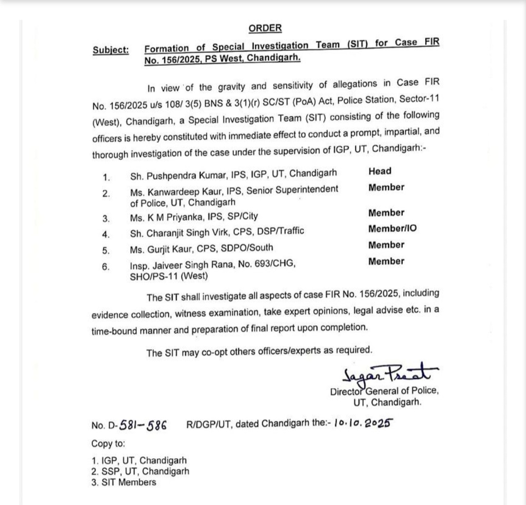 एसआईटी की अध्यक्षता आईजीपी पुष्पेन्द्र कुमार करेंगे, जबकि इसमें वरिष्ठ आईपीएस और डीएसपी स्तर के अधिकारी शामिल हैं। टीम को 9 अक्तूबर की रात चंडीगढ़ के सेक्टर-11 में दर्ज हुई एफआईआर नंबर 156/2025 के तहत दर्ज मामले की हर पहलू से जांच, साक्ष्य एकत्रित करने, गवाहों के बयान दर्ज करने और विशेषज्ञ राय लेने के निर्देश दिए गए हैं। डीजीपी सागर प्रीत हुड्डा द्वारा गठित एसआईटी के चीफ आईजीपी पुष्पेन्द्र कुमार होंगे। चंडीगढ़ की एसएसपी कंवरदीप कौर, सिटी एसपी केएम प्रियंका, डीएसपी-ट्रैफिक चरणजीत सिंह विर्क, साऊथ में एसडीपीओ गुरजीत कौर तथा सेक्टर-11 पुलिस स्टेशनप के इंस्पेक्टर जयवीर सिंह राणा को एसआईटी में बतौर सदस्य शामिल किा है। एसआईटी को निर्देश दिए हैं कि वह समयबद्ध तरीके से जांच पूरी कर अंतिम रिपोर्ट तैयार करे। आवश्यकता पड़ने पर अन्य विशेषज्ञों या अधिकारियों की सेवाएं भी ले सकती है।