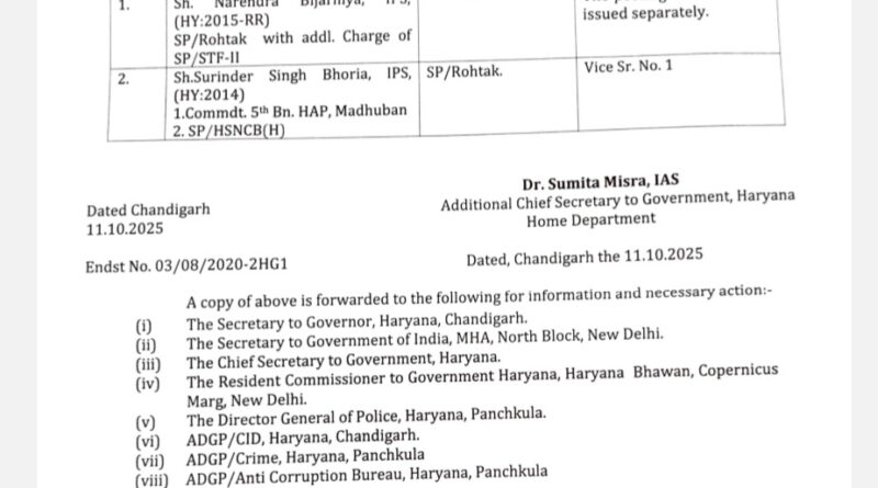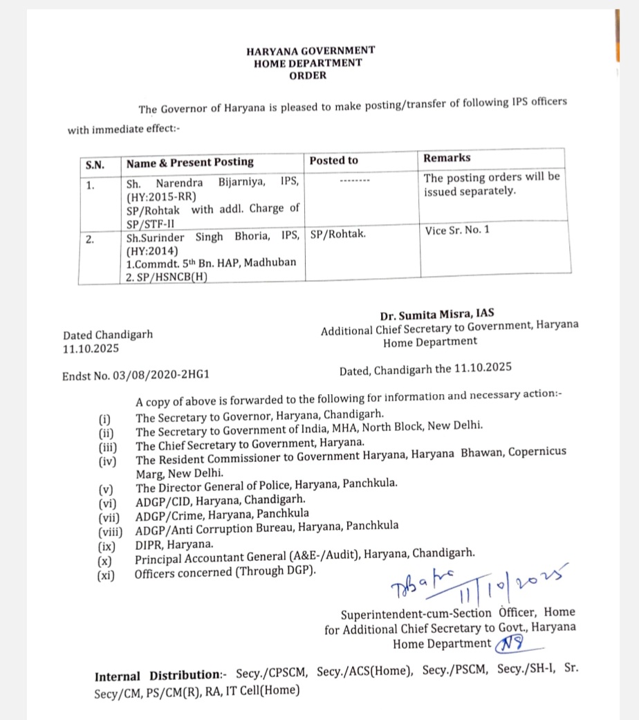 *हरियाणा सरकार ने रोहतक के SP नरेन्द्र बिजरनिया IPS को पद से हटाया*