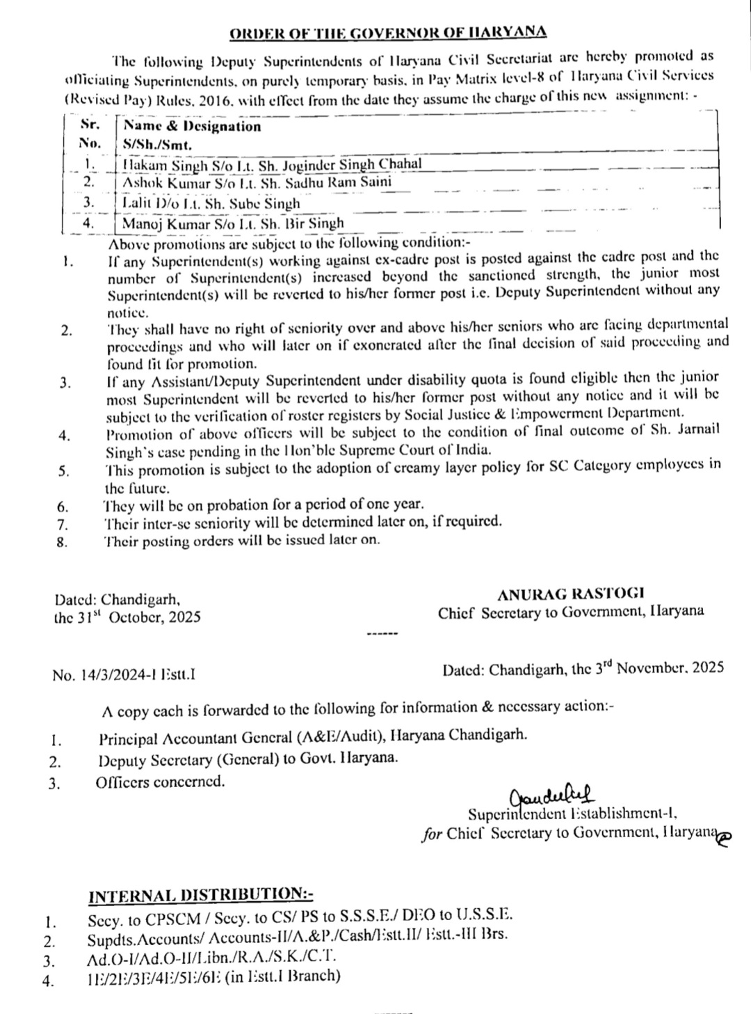 *हरियाणा सरकार ने सिविल सचिवालय चंडीगढ़ के चार डिप्टी सुपरिंटेंडेंट को पदोन्नति प्रदान कर तुरन्त प्रभाव से बनाया सुपरिंटेंडेंट* *आदेश जारी, देखे आदेश की कॉपी*