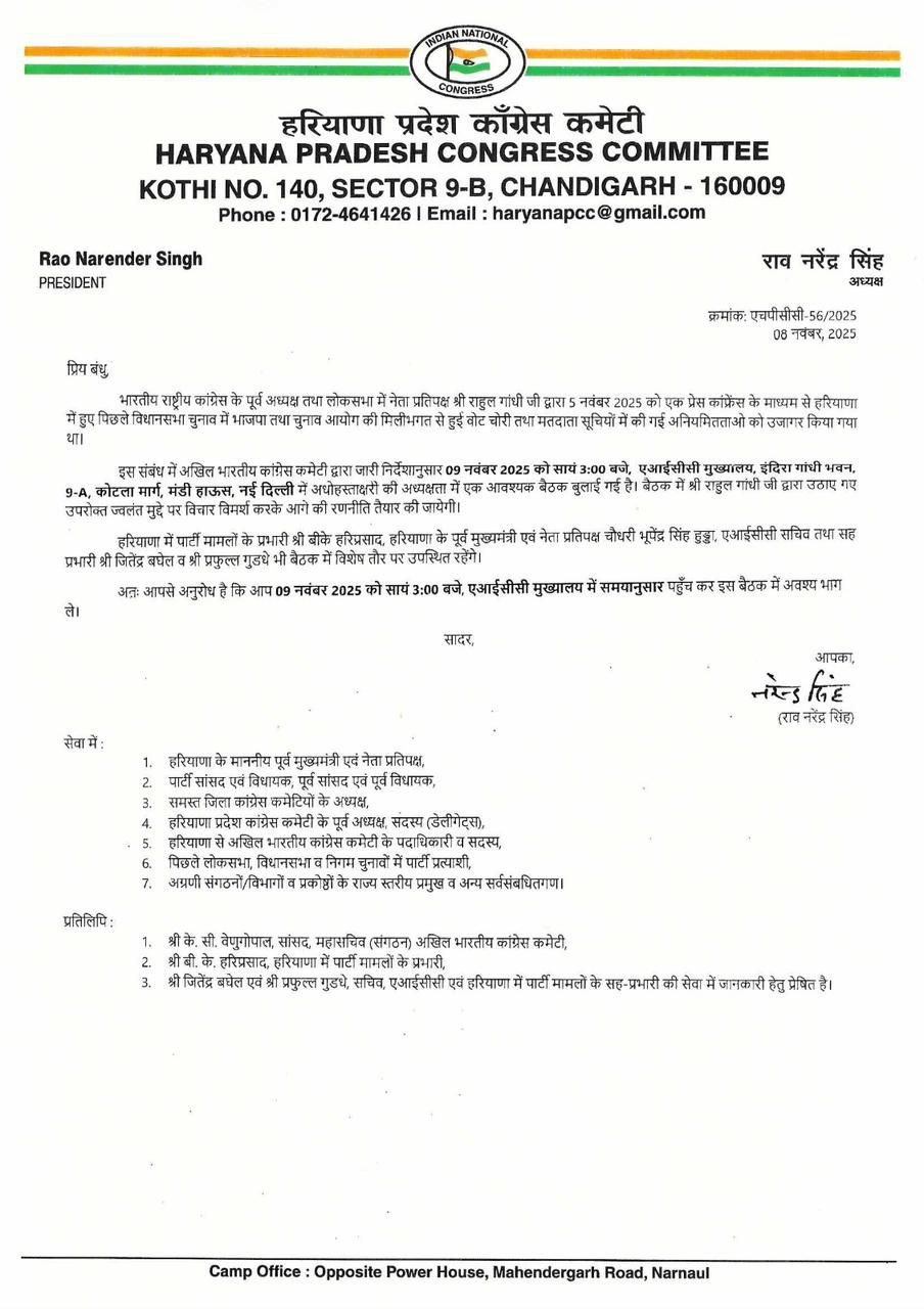 चंडीगढ़ :- हरियाणा प्रदेश कांग्रेस कमेटी (HPCC) द्वारा जारी एक आधिकारिक पत्र के अनुसार, राज्य में कांग्रेस के सभी प्रमुख नेताओं की एक अहम बैठक आज यानी कि 9 नवंबर 2025 को नई दिल्ली स्थित अखिल भारतीय कांग्रेस कमेटी (AICC)