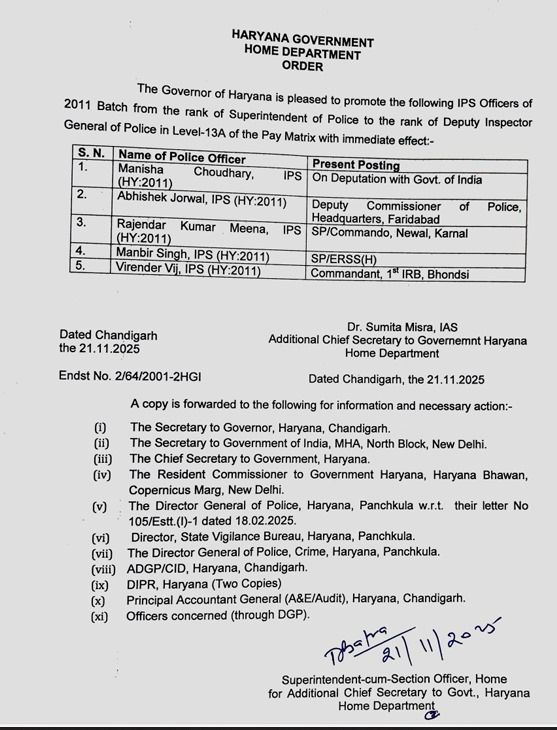 करनालखेलचंडीगढ़जिंददेश-विदेशपंचकुलापंजाबपानीपतराज्यहरियाणा *हरियाणा सरकार ने 5 पुलिस कप्तान को तरक्की देकर बनाया DIG / बड़ा फेरबदल करते हुए 5 IPS अधिकारियों के किये नियुक्ति एवं तबादले* देखे लिस्ट* November 21, 2025 RAJESH OBEROI *राणा ओबराय* *राष्ट्रीय खोज/भारतीय न्यूज,* ,,,,,,,,,,,,,,,,,,,,, *हरियाणा सरकार ने 5 पुलिस कप्तान को तरक्की देकर बनाया DIG / बड़ा फेरबदल करते हुए 5 IPS अधिकारियों के किये नियुक्ति एवं तबादले* *देखे लिस्ट*