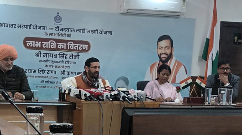 *मुख्यमंत्री नायब सैनी ने हरियाणा निवास चंडीगढ़ में आयोजित प्रेसवार्ता में पत्रकारों को सम्बोधित करते हुए/ साथ में है सूचना एवं जनसंपर्क विभाग के महानिदेशक के एम पांडुरंग*
