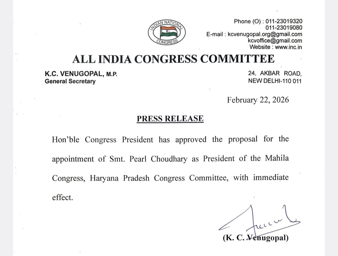 करनालखेलचंडीगढ़जिंददेश-विदेशपंचकुलापंजाबपानीपतराज्यहरियाणा *पर्ल चौधरी बनी हरियाणा महिला कांग्रेस का प्रदेशअध्यक्ष* February 22, 2026 RAJESH OBEROI *राणा ओबराय* *राष्ट्रीय खोज/भारतीय न्यूज,* ,,,,,,,,,,,,,,,,,,,, *पर्ल चौधरी बनी हरियाणा महिला कांग्रेस का प्रदेशअध्यक्ष*