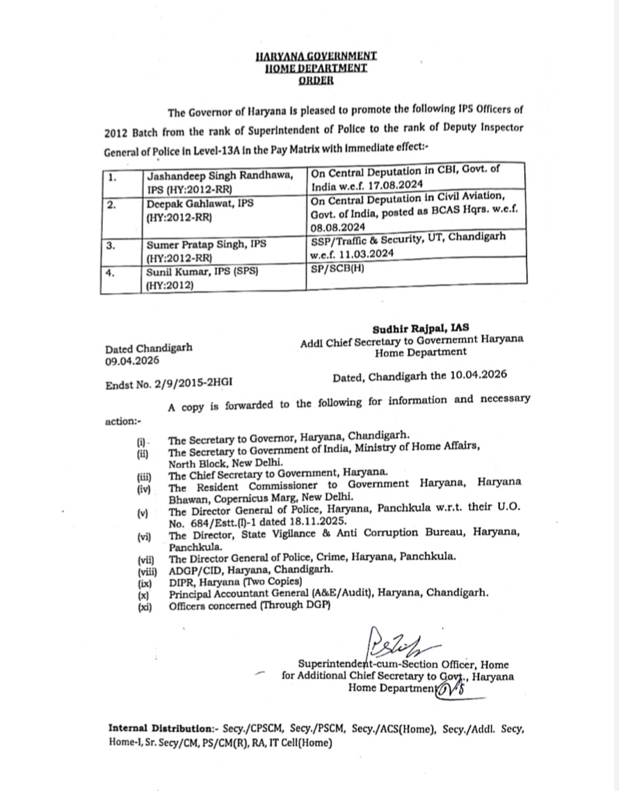 अतिरिक्त मुख्य सचिव गृह विभाग हरियाणा द्वारा जारी आदेशों के अनुसार प्रमोट किए गए अधिकारियों में जशनदीपसिंह रंधावा, दीपक गहलावत, सुमेर प्रताप सिंह और सुनील कुमार शामिल हैं।