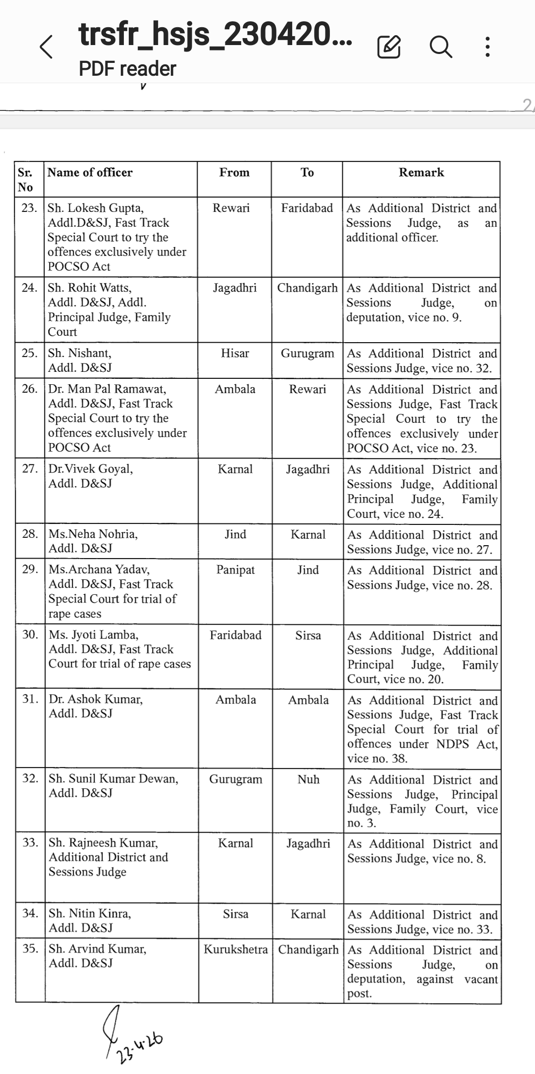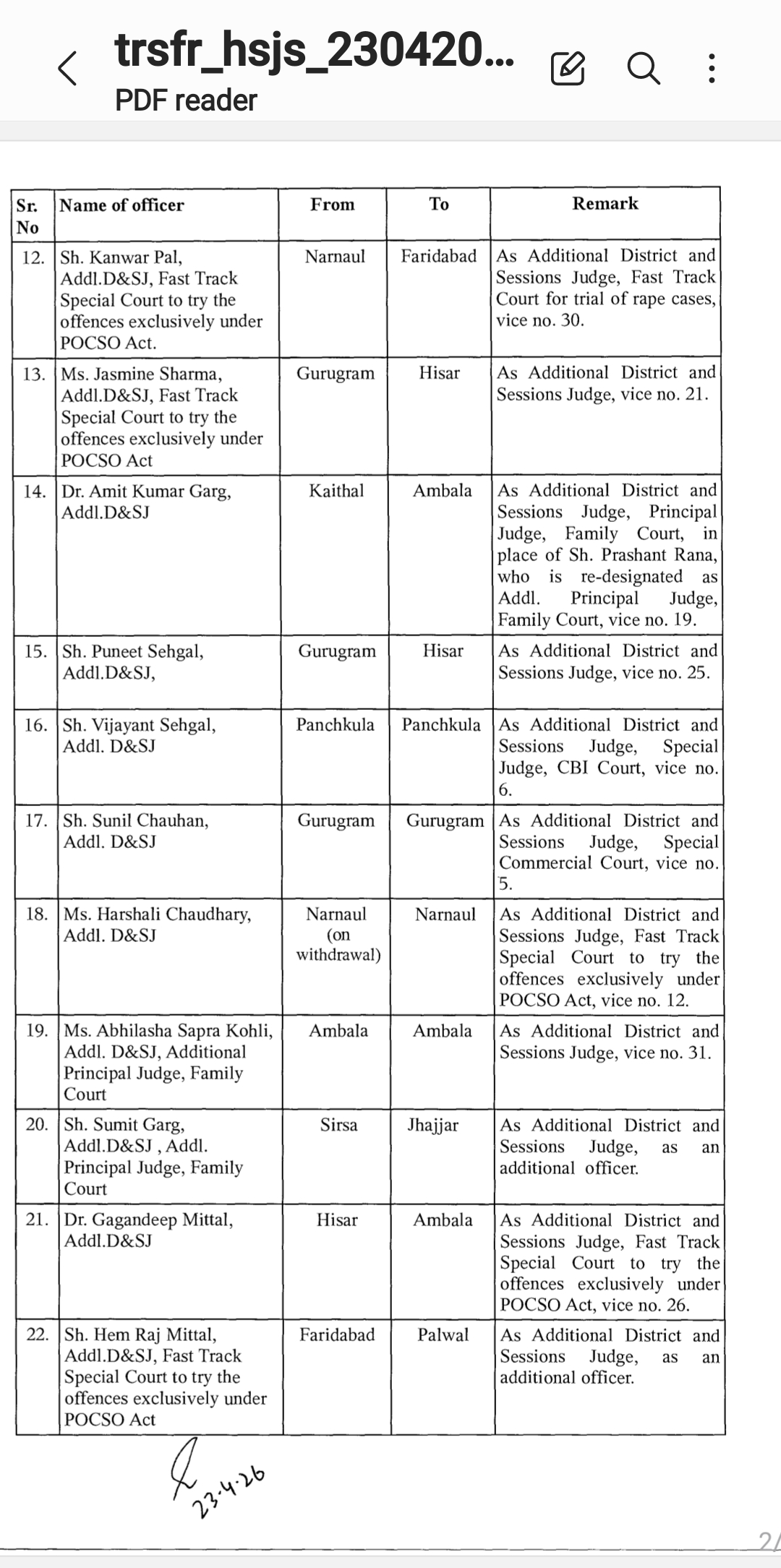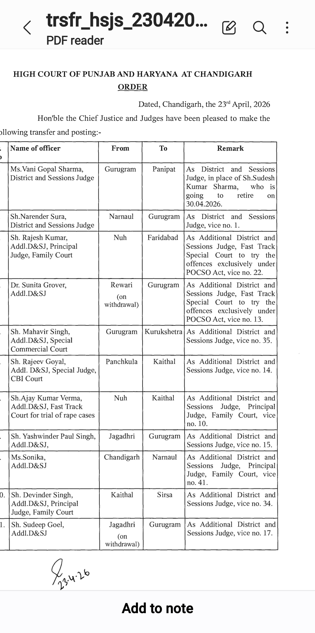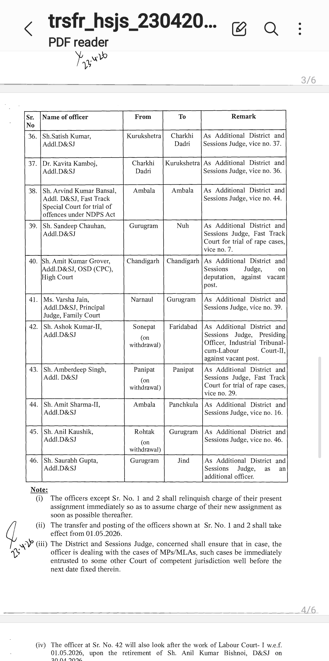 *पंजाब & हरियाणा हाइकोर्ट ने किये सेशन जज तथा अतिरिक्त सेशन जजो के तबादले* *देखे लिस्ट, कौन कहा लगा*
